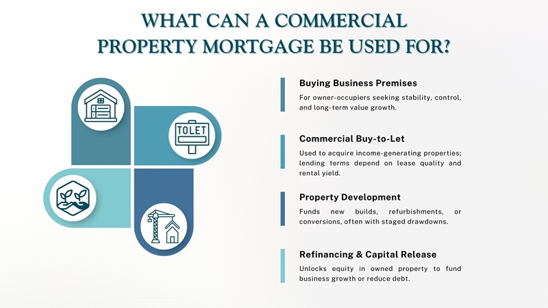 The scope of commercial mortgages extends beyond property purchase. These loans are used across a wide range of business and investment scenarios, each with its own lending criteria and risk profile.