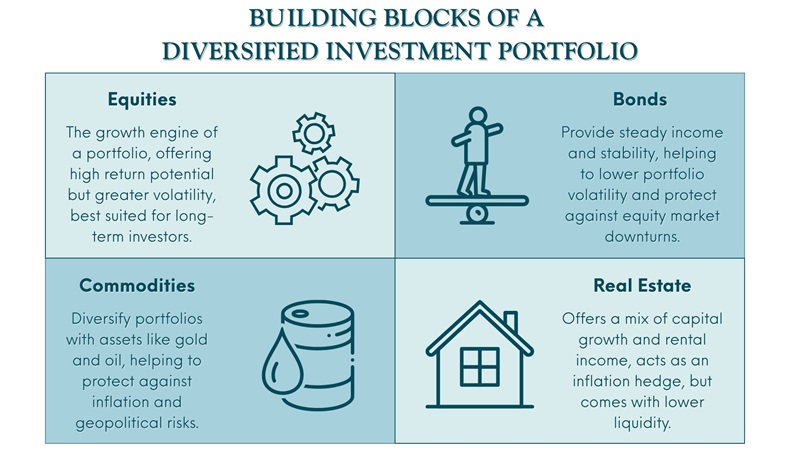 Through a properly diversified mix of equities, bonds, real estate, and commodities, investments can support long-term goals like retirement, education funding, or creating a legacy.
