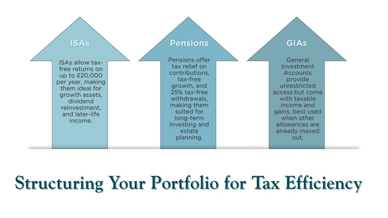 The principle behind tax-efficient structuring is straightforward: hold tax-efficient assets in taxable accounts, and tax-inefficient assets in tax-sheltered accounts. For example, income-generating bonds or dividend-heavy funds may be better placed in a pension or ISA, while low-turnover growth equities might sit in a GIA where gains can be managed more precisely.