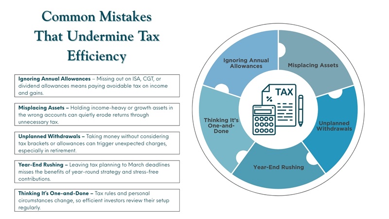 Too often, tax efficiency is treated as an annual scramble. ISAs and pension contributions are rushed in March, rather than used consistently throughout the year. Regular planning reduces stress and gives you better access to opportunities as they arise.