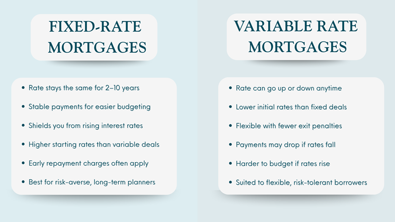 Variable rate mortgages give you room to move. You can often overpay without penalty, switch products more easily, or remortgage without early repayment charges. Fixed-rate mortgages, on the other hand, offer consistency — but limit your flexibility unless you're willing to pay a fee to break out early.