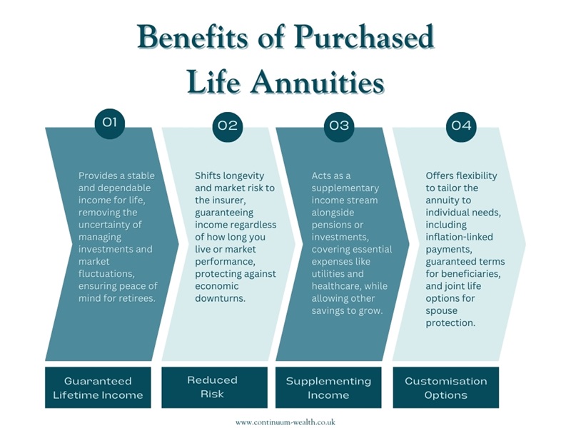 Purchased life annuities offer several key benefits that make them an attractive option for retirees looking to secure a reliable income stream: