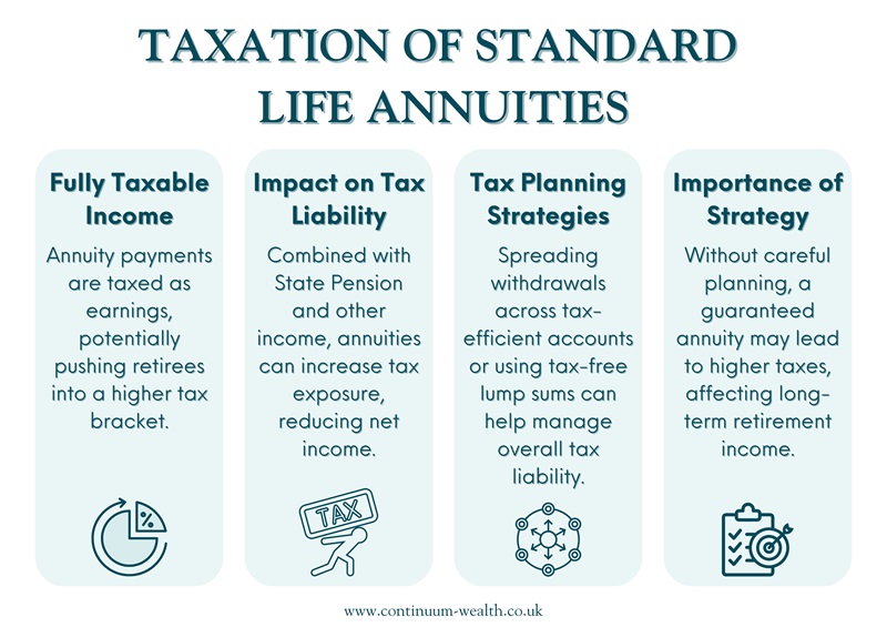 The State Pension is automatically taxable, which means that receiving it alongside an annuity could push a retiree into a higher tax bracket. In some cases, delaying the State Pension (which increases its payout) and drawing from other tax-efficient sources first can help reduce overall taxation.