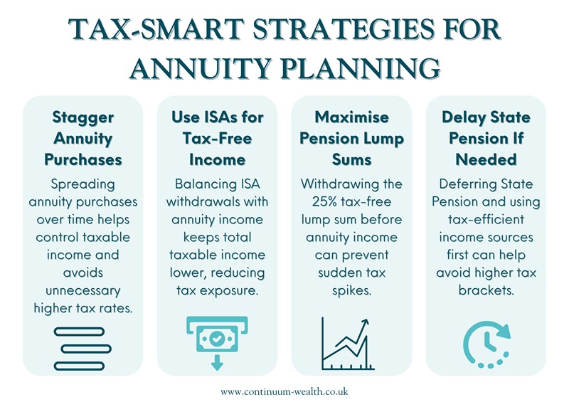 Those still holding pension funds have the option to withdraw up to 25% tax-free before committing to an annuity. Using this lump sum strategically—before annuity income starts—can help smooth out taxable income levels and prevent a sudden jump in tax liability.