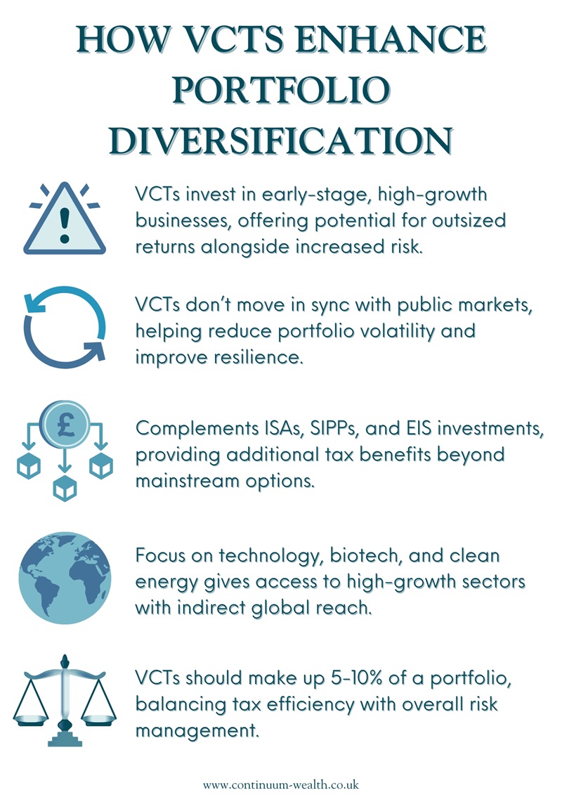 For investors with significant exposure to public markets, real estate, or fixed-income assets, VCTs serve as a counterbalance, offering the potential for outsized gains from companies at an early stage of their growth trajectory.