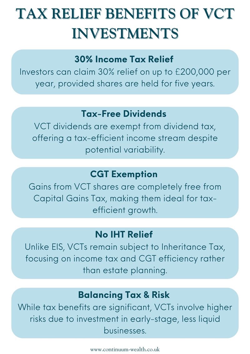 High-net-worth individuals and sophisticated investors who have already maximised ISA and pension allowances often turn to VCTs for their 30% income tax relief, tax-free dividends, and CGT exemption. However, these benefits come with a trade-off: longer holding periods, lower liquidity, and exposure to higher-risk, less-established companies.