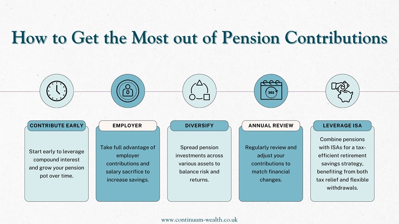 Maximising the benefits of your pension contributions requires strategic planning to ensure you’re making the most of tax relief, investment growth, and contribution limits. By adopting a tailored approach to contributions, you can significantly enhance your retirement savings.