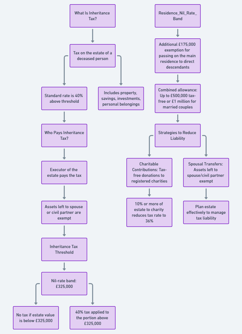 Inheritance tax is a tax levied on the estate of a person who has passed away. It applies to the total value of their assets, including property, savings, investments, and personal belongings. The standard rate of inheritance tax is 40%, and it is applied to the portion of the estate that exceeds the inheritance tax threshold.