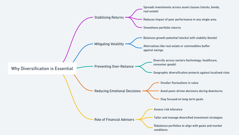 Diversification is the foundation of effective portfolio management, particularly during periods of market volatility. It involves spreading investments across different asset classes, sectors, and geographic regions to reduce exposure to any single risk. By doing so, diversification helps stabilise returns and provides a safeguard against the unpredictable nature of financial markets.