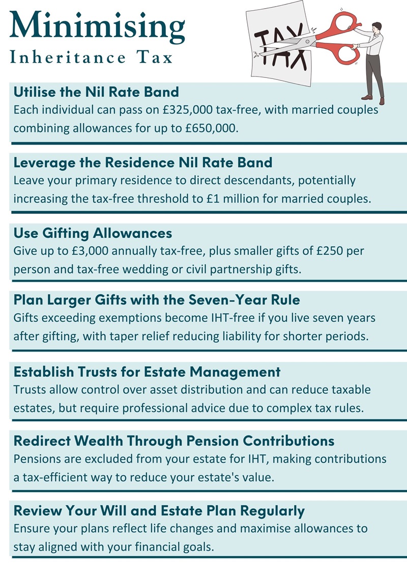 Minimising the impact of inheritance tax on your estate requires careful planning and a combination of strategies. By fully utilising allowances, exemptions, and thoughtful asset structuring, you can significantly reduce the tax burden while preserving wealth for future generations. Below are actionable approaches to consider: