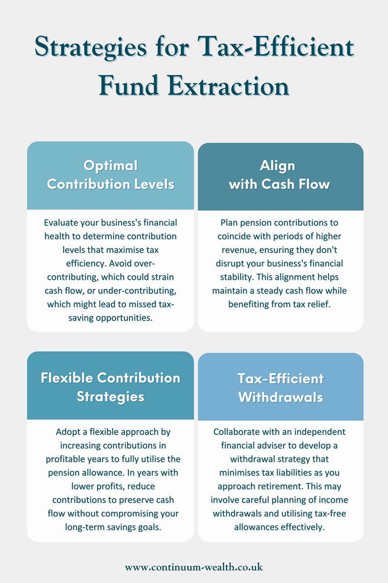When planning business pension contributions, it’s essential to consider strategies for tax-efficient fund extraction to maximise the benefits of the increased pension allowance.