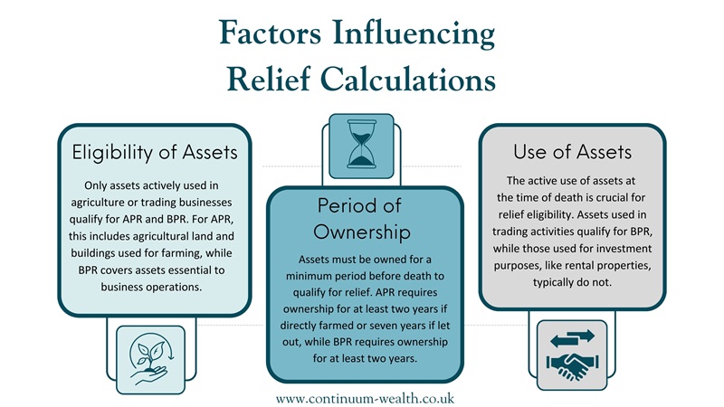 The calculation of APR and BPR's impact involves assessing the value of the agricultural property and business assets eligible for relief and applying the appropriate percentage of relief (up to 100%). This process can significantly reduce the taxable value of the estate, thereby lowering the IHT liability.