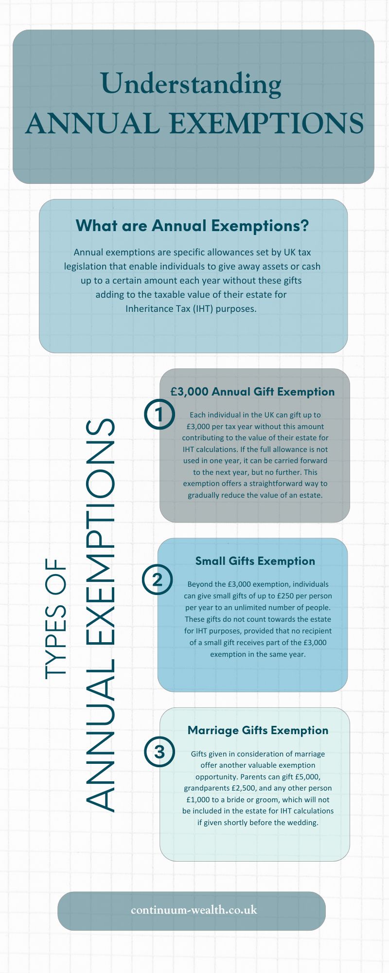 In UK estate planning, annual exemptions are a powerful strategy for minimising inheritance tax. These exemptions, when used wisely, offer a practical and effective means to transfer wealth to heirs while minimising the tax burden on an estate.